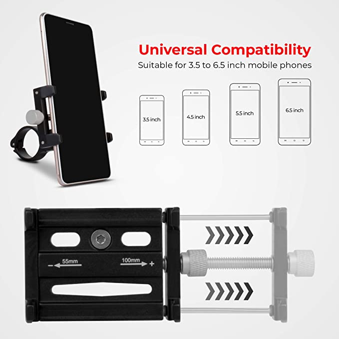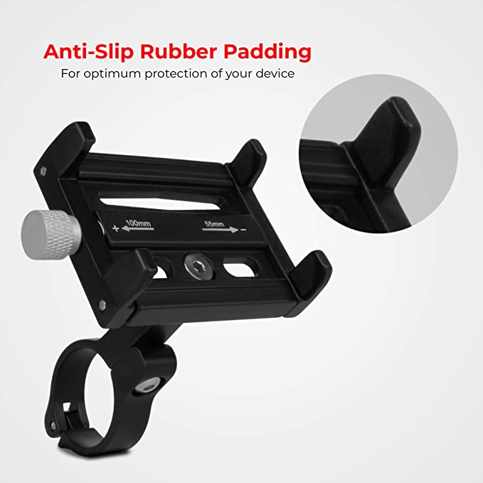 - ANTI-SLIP SOFT TOUCH RUBBER PADDING - Provided on each claw for protecting your device against scratches & slip off while riding on bumpy terrains. Holds all mobiles from Apple iPhone OnePlus Google Pixel Lenovo Moto Asus Oppo Xiaomi LG Vivo Honor etc.
