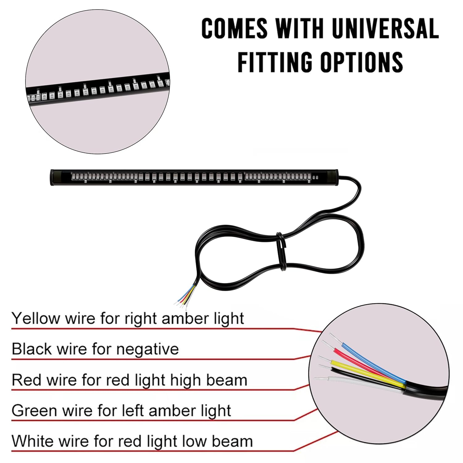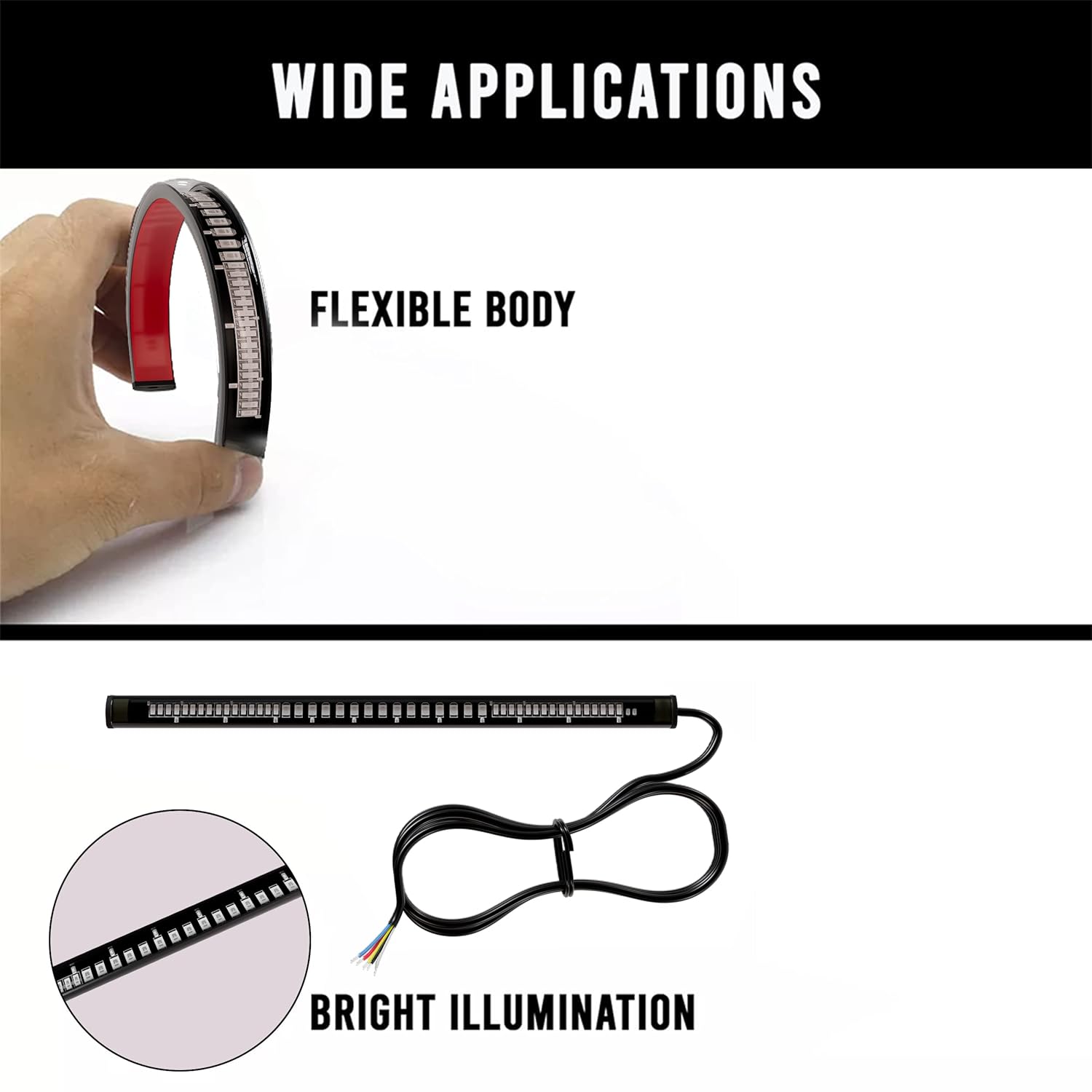 - UNIVERSAL COMPATIBILITY – The offered taillight LED strip with braking and turn signal indicator can be easily installed on any make or model of motorcycle, scooty, scooter, ATV, UTV, car and even on commercial vehicle easily.